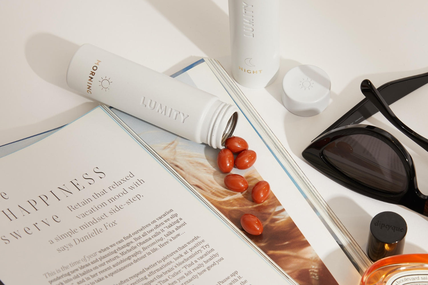 Image of a man holding a Lumity Morning bottle, a woman is sitting next to him on a table reading a magazine, coffee cup, notebook, mobile phone and a Lumity Night bottle on the table; plain background